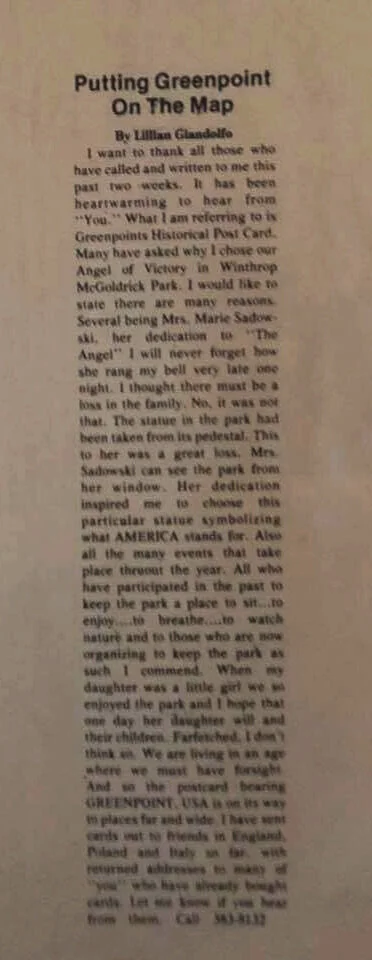 I want to thank all those who have called and written to me this past two weeks. It has been heartwarming to hear from “You”. What I am referring to is Greenpoints Historical Post Card. Many have asked why I chose our Angel of Victory in Winthrop McGoldrick Park. I would like to state there are many reasons. Several being Mrs. Marie Sadowski, her dedication to “The Angel” I will never forget how she rang my bell very late one night. I thought there must be a loss in the family. No, it was not that. The statue in the park has been taken from its pedestal. This to her was a great loss. Mrs. Sadowski can see the park from her window. Her dedication inspired me to choose this particular statue symbolizing what AMERICA stands for. Also all the many events that take place throughout the year.